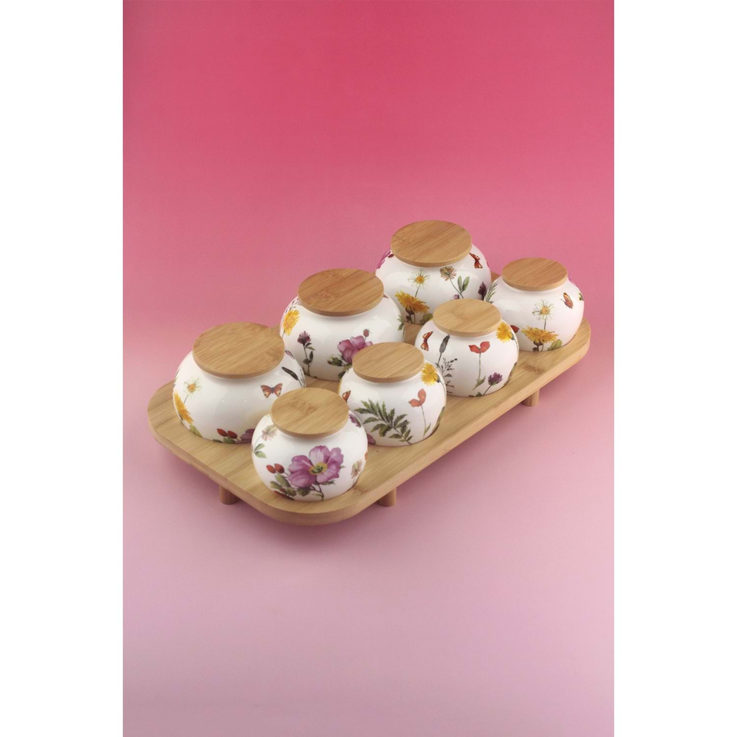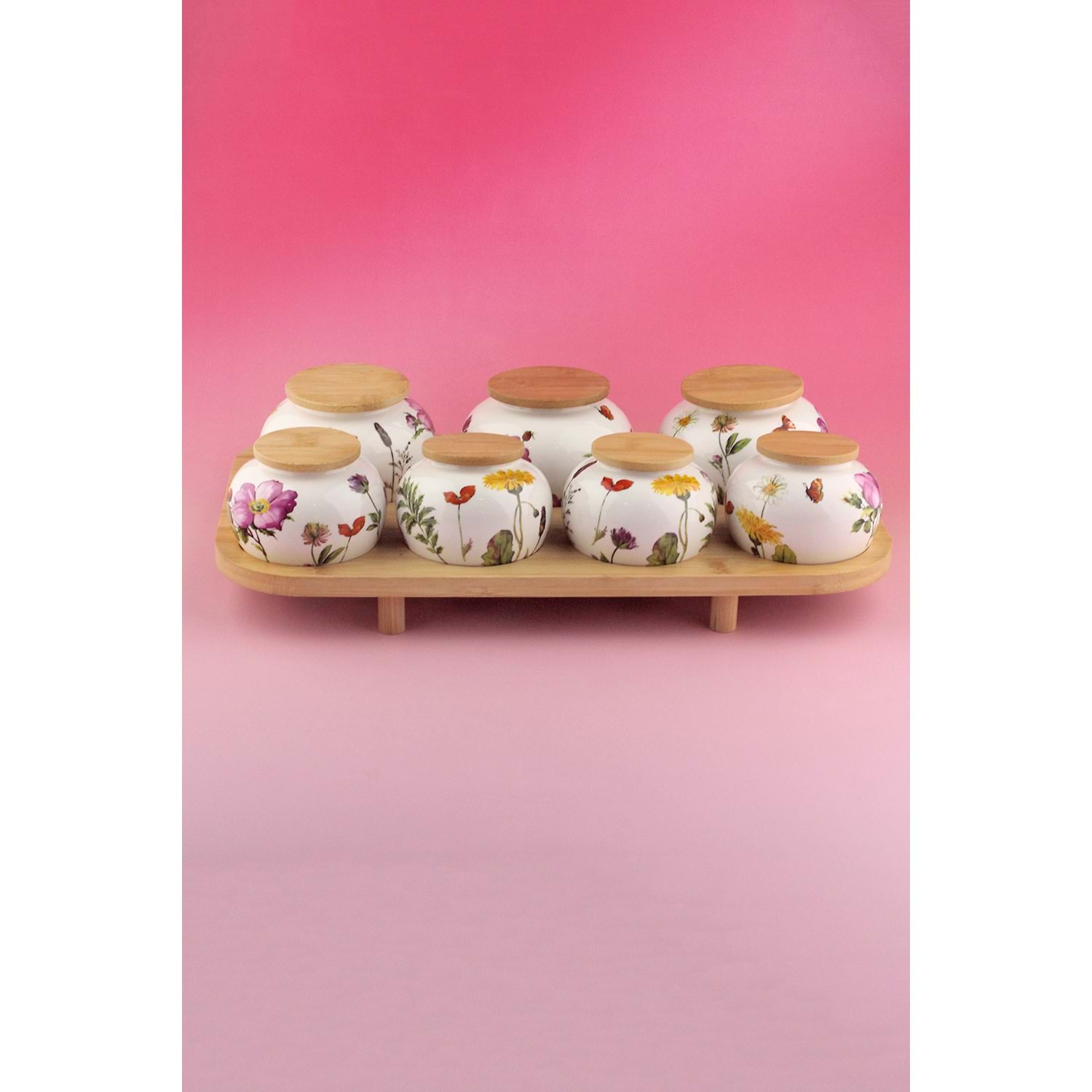 7 adet porselen baharatlık vakumlu bambu kapaklı