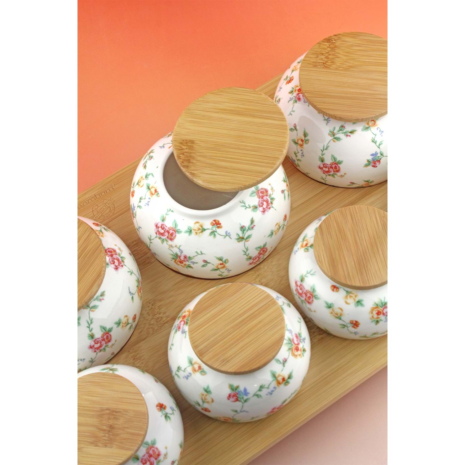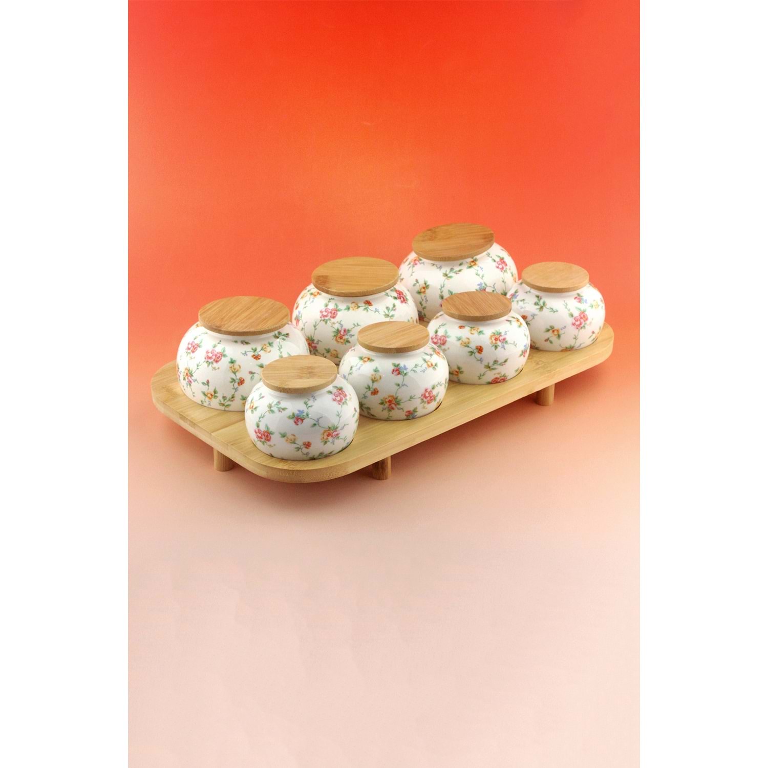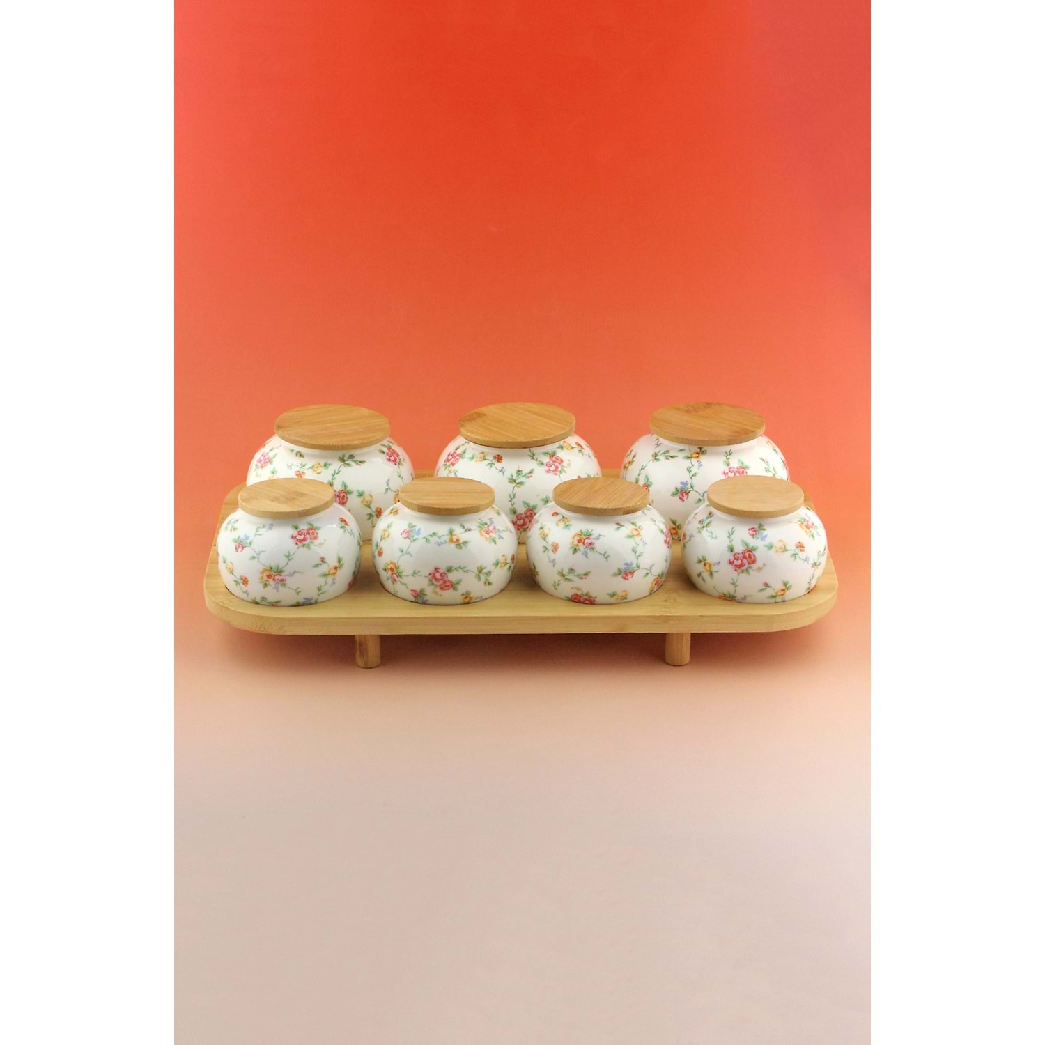 Mine çiçeği bambu standlı 7 li porselen baharatlık