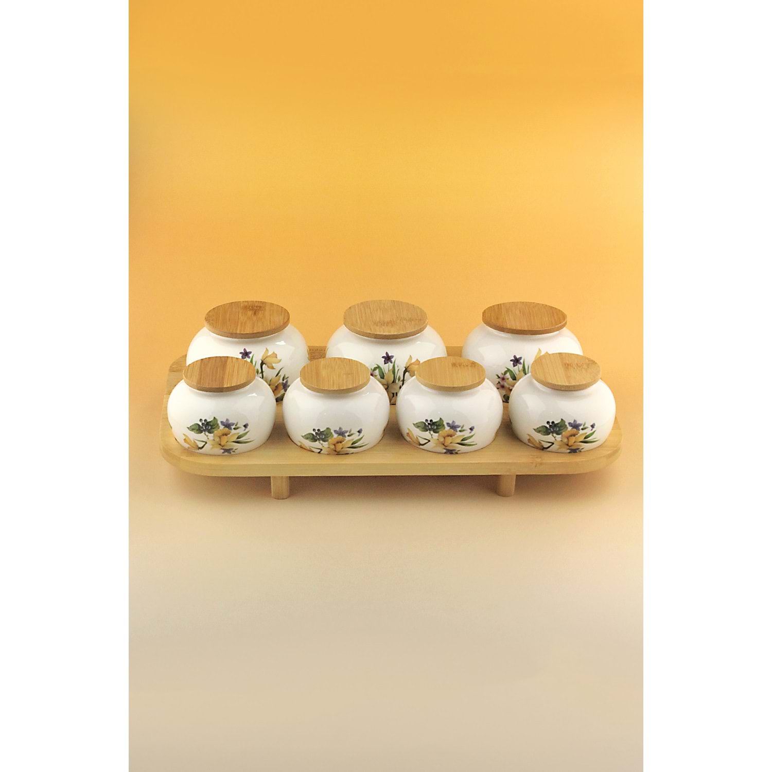 7 adet porselen baharatlık vakumlu bambu kapaklı