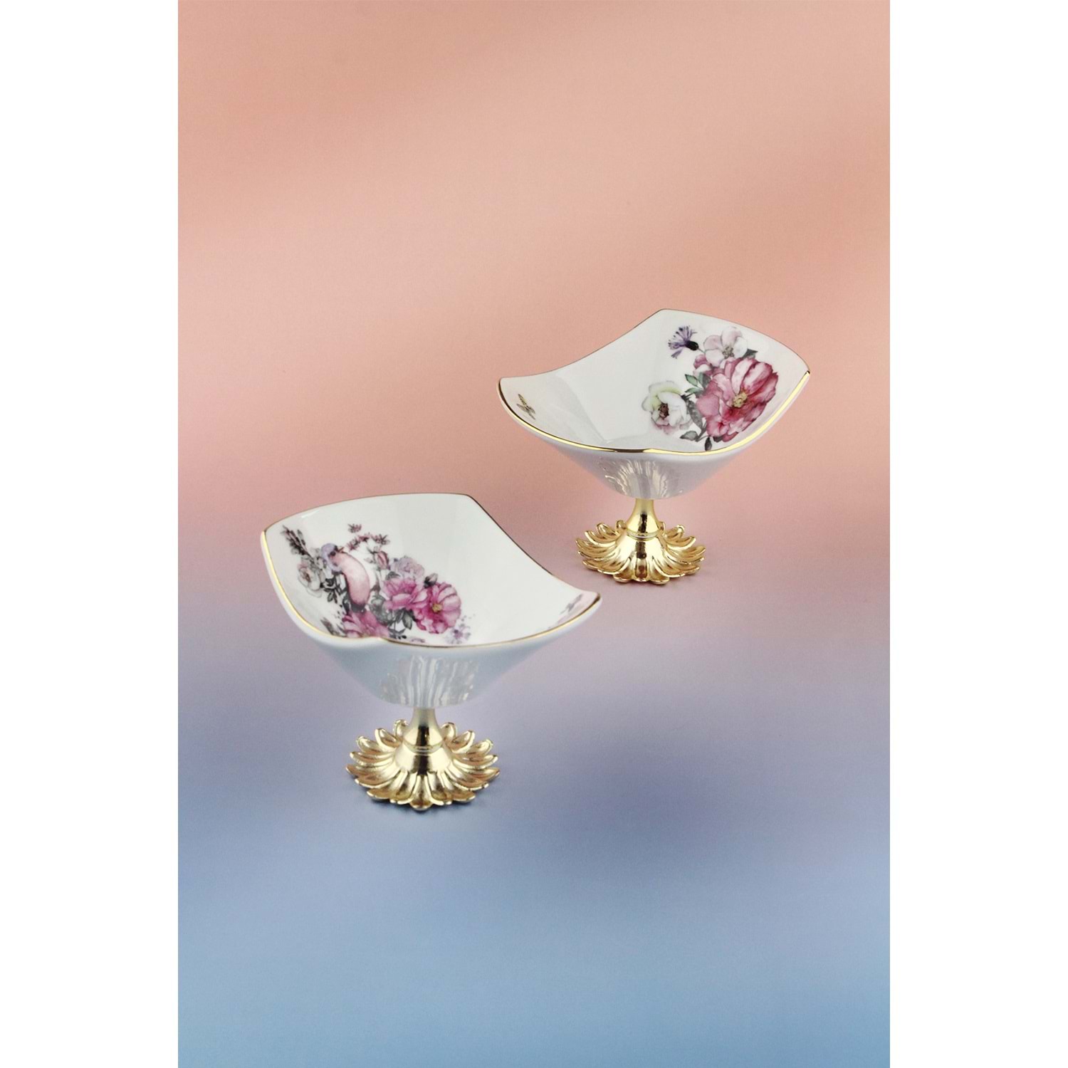 2 adet metal ayaklı altın yaldızlı porselen kase 12 x 9 cm, yükseklik 8 cm,