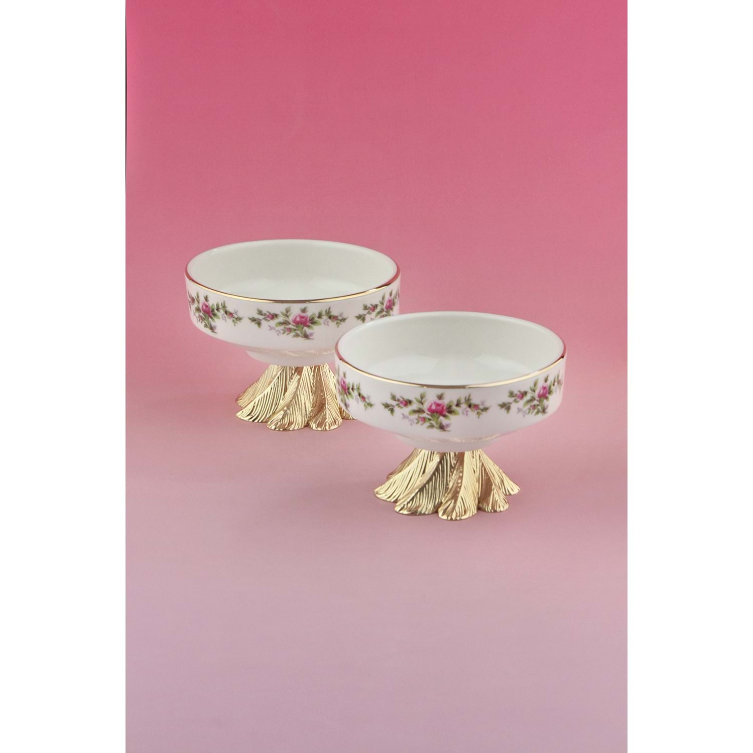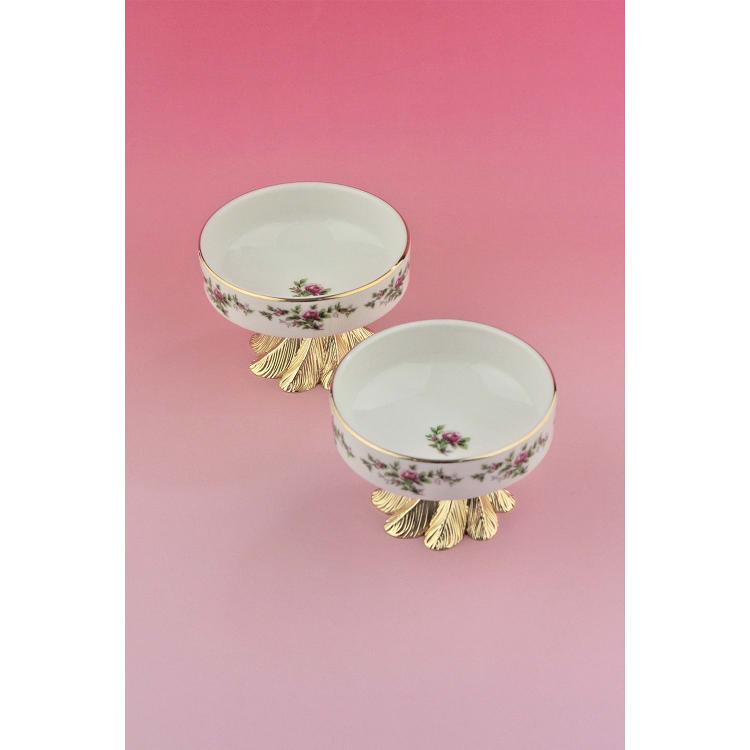 2 adet metal ayaklı altın yaldızlı porselen kase çap 10 cm, yükseklik 8 cm,