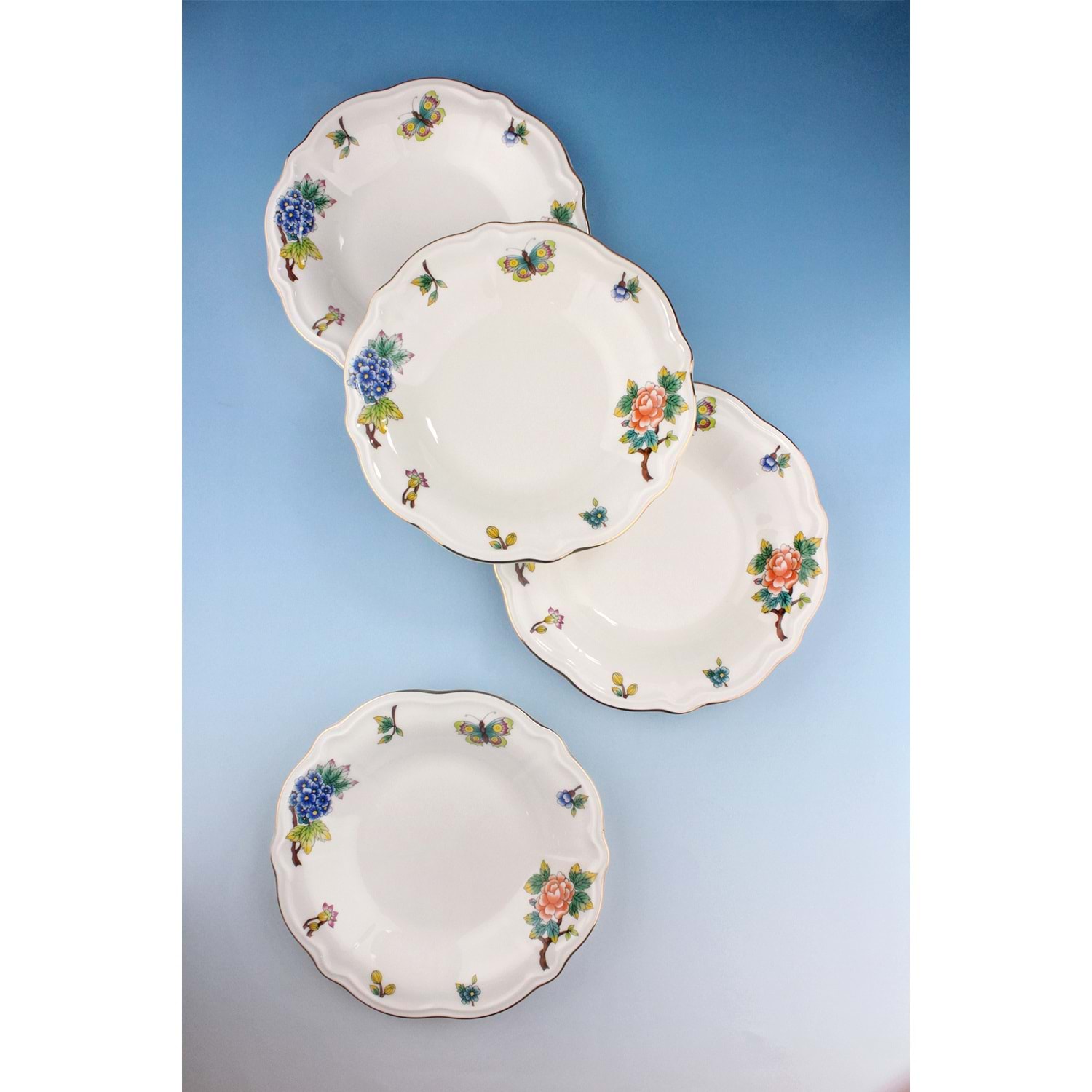Çiçek buketi altın yaldızlı 4 parça porselen yemek tabağı