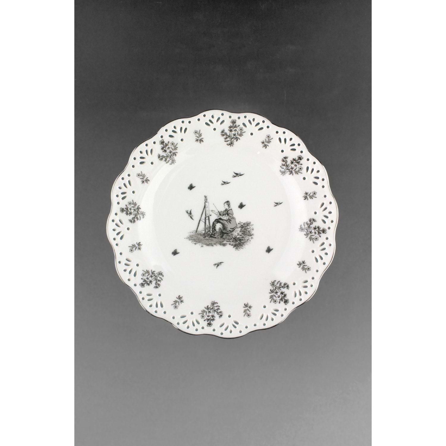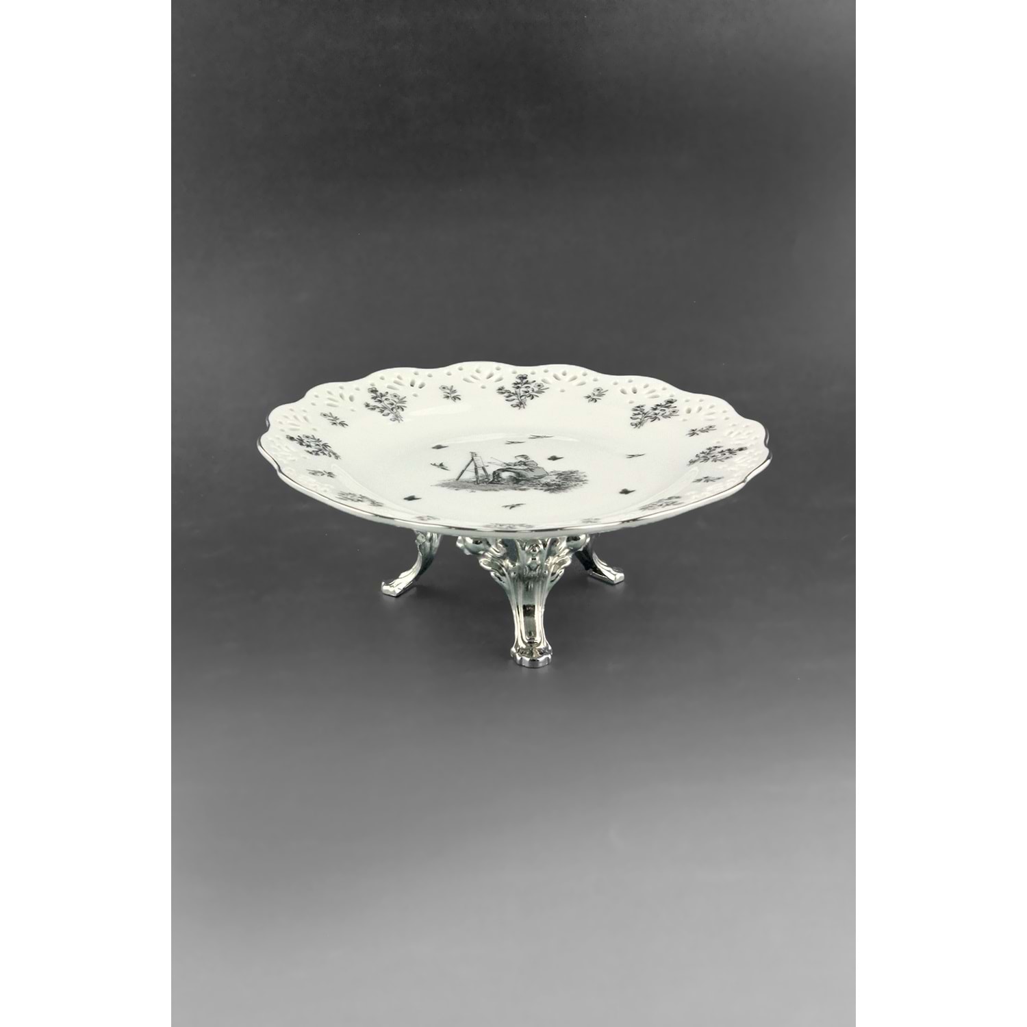 1 adet metal ayaklı porselen tabak çapı 19 cm, yükseklik 7 cm,