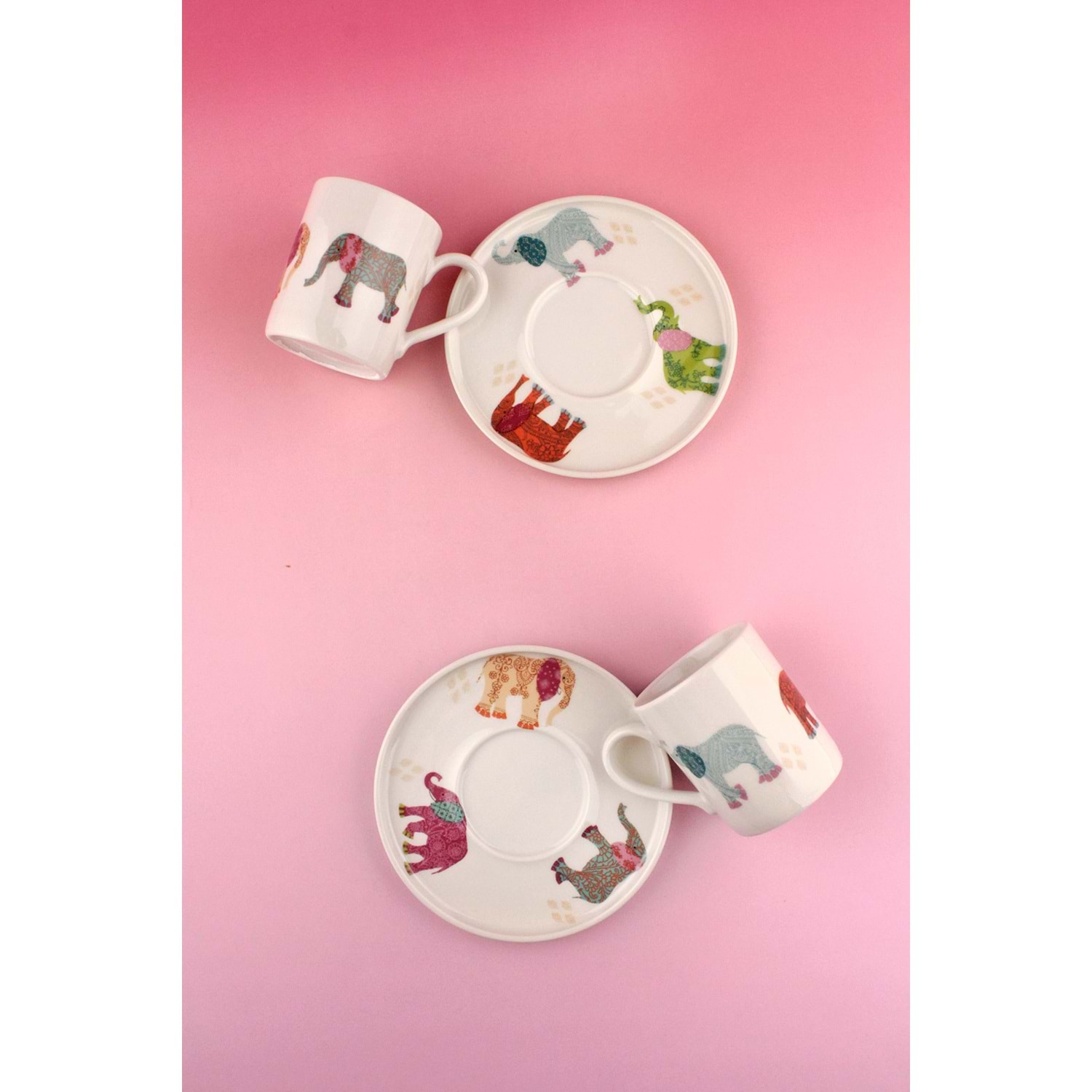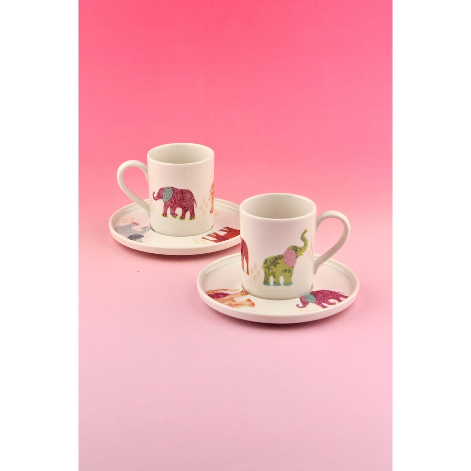 Renkli fil iki kişilik porselen kahve fincan takımı