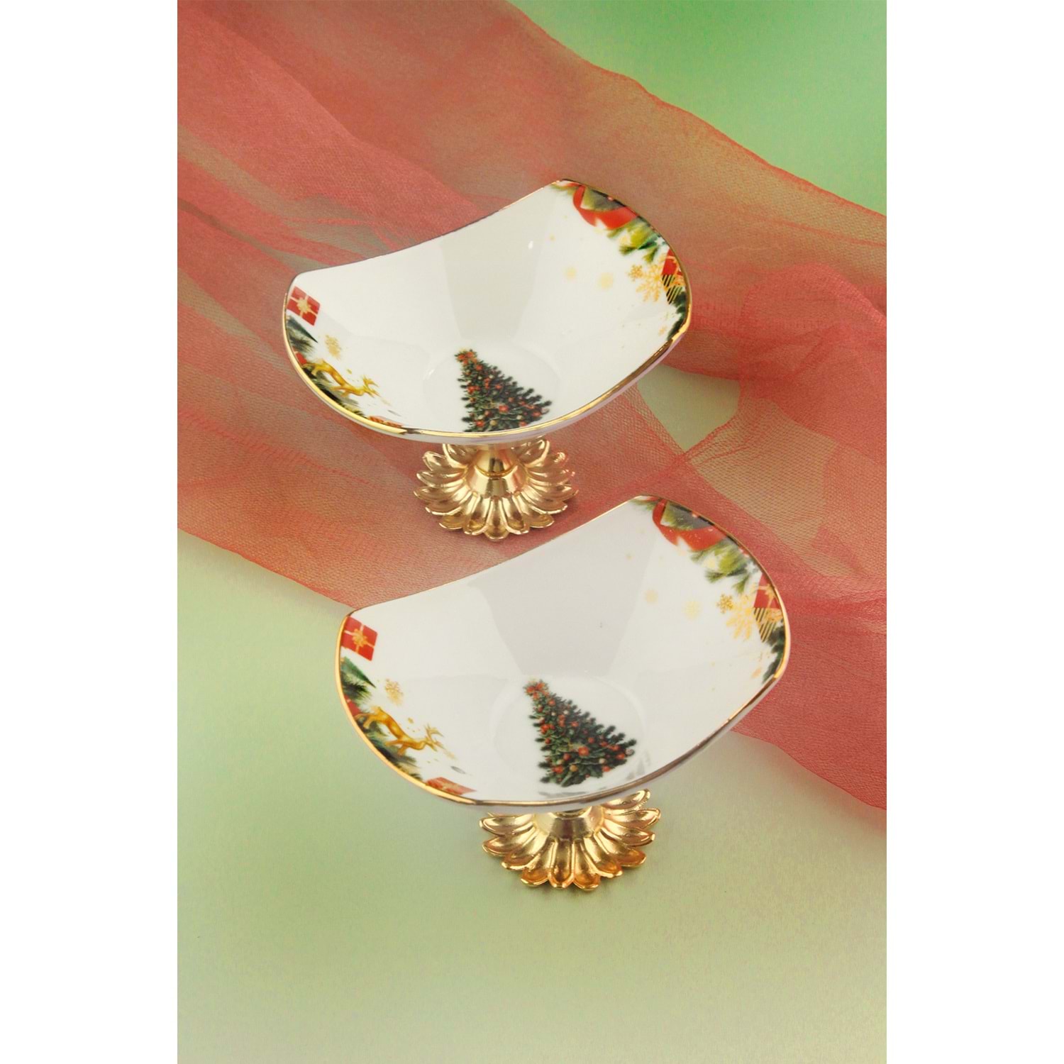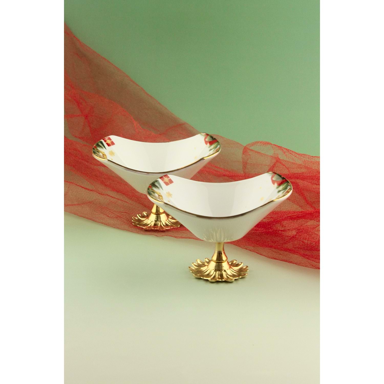 2 adet metal ayaklı altın yaldızlı porselen kase 12 x 9 cm, yükseklik 8 cm,