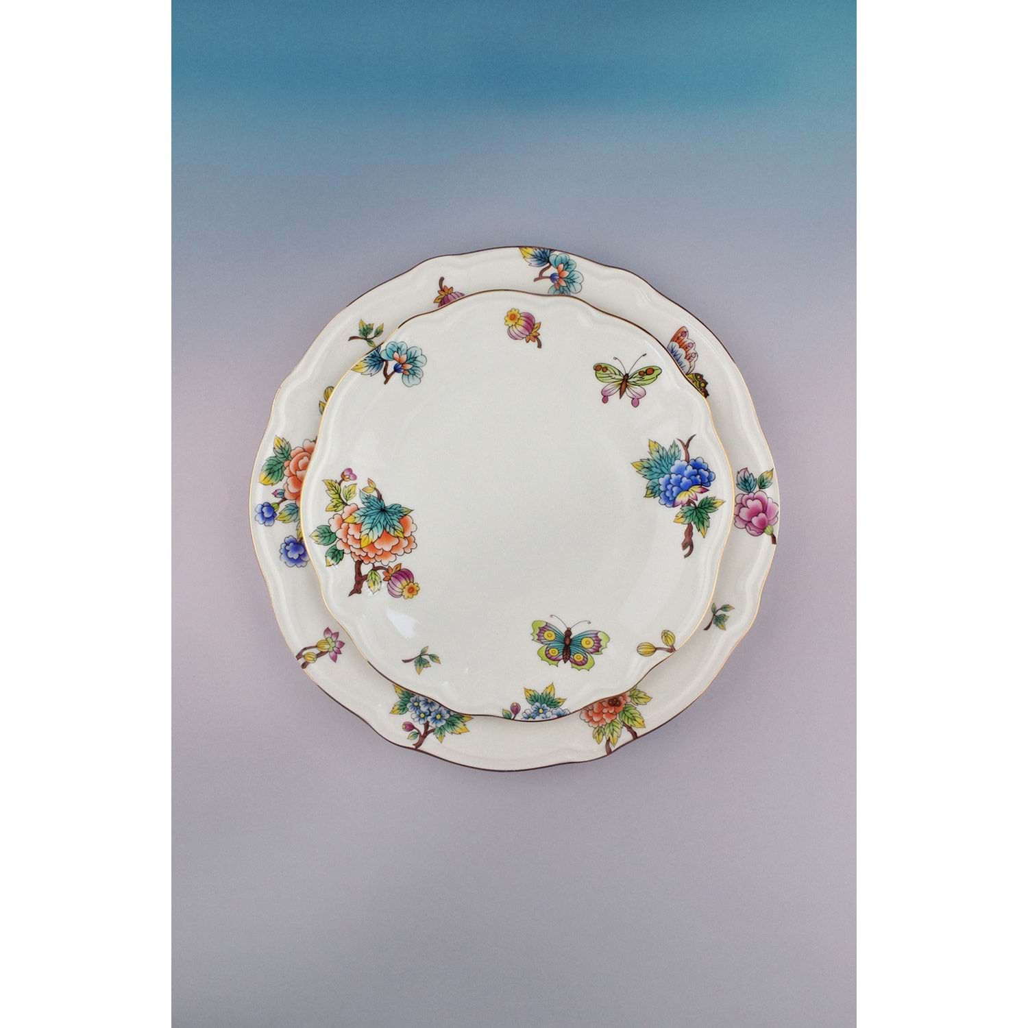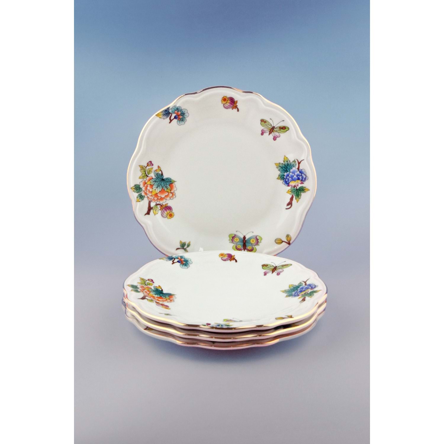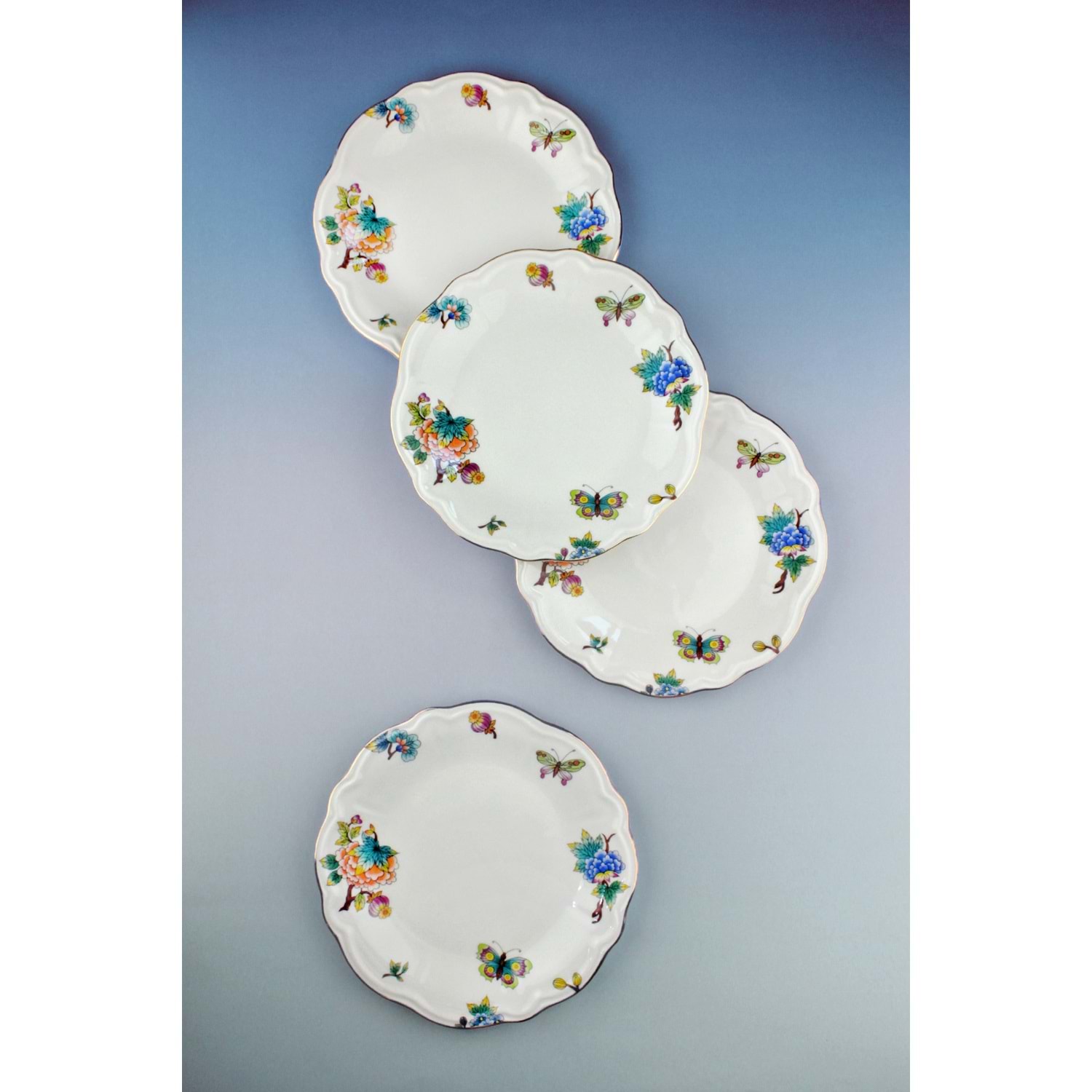 Çiçek buketi altın yaldızlı 4 parça porselen pasta tabağı