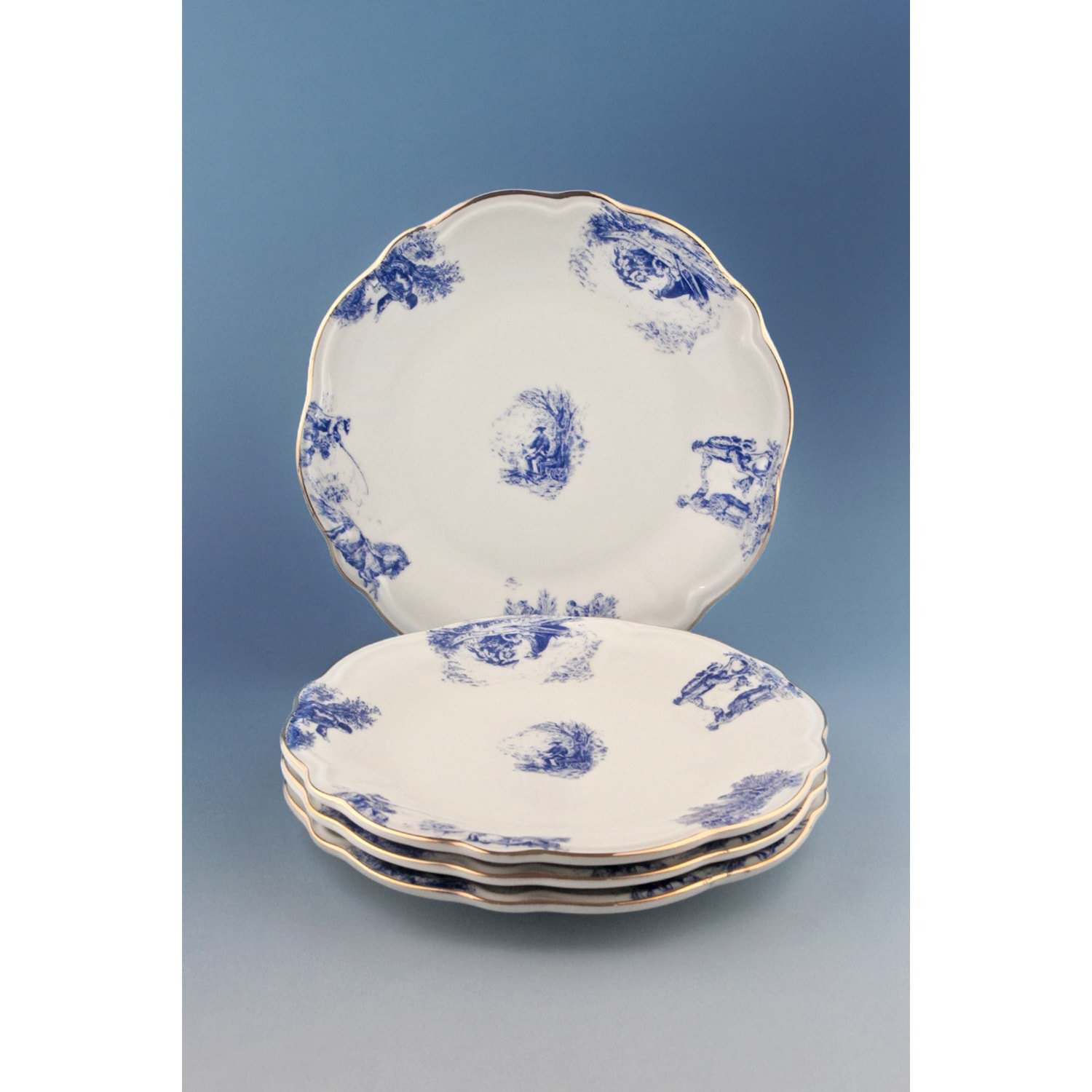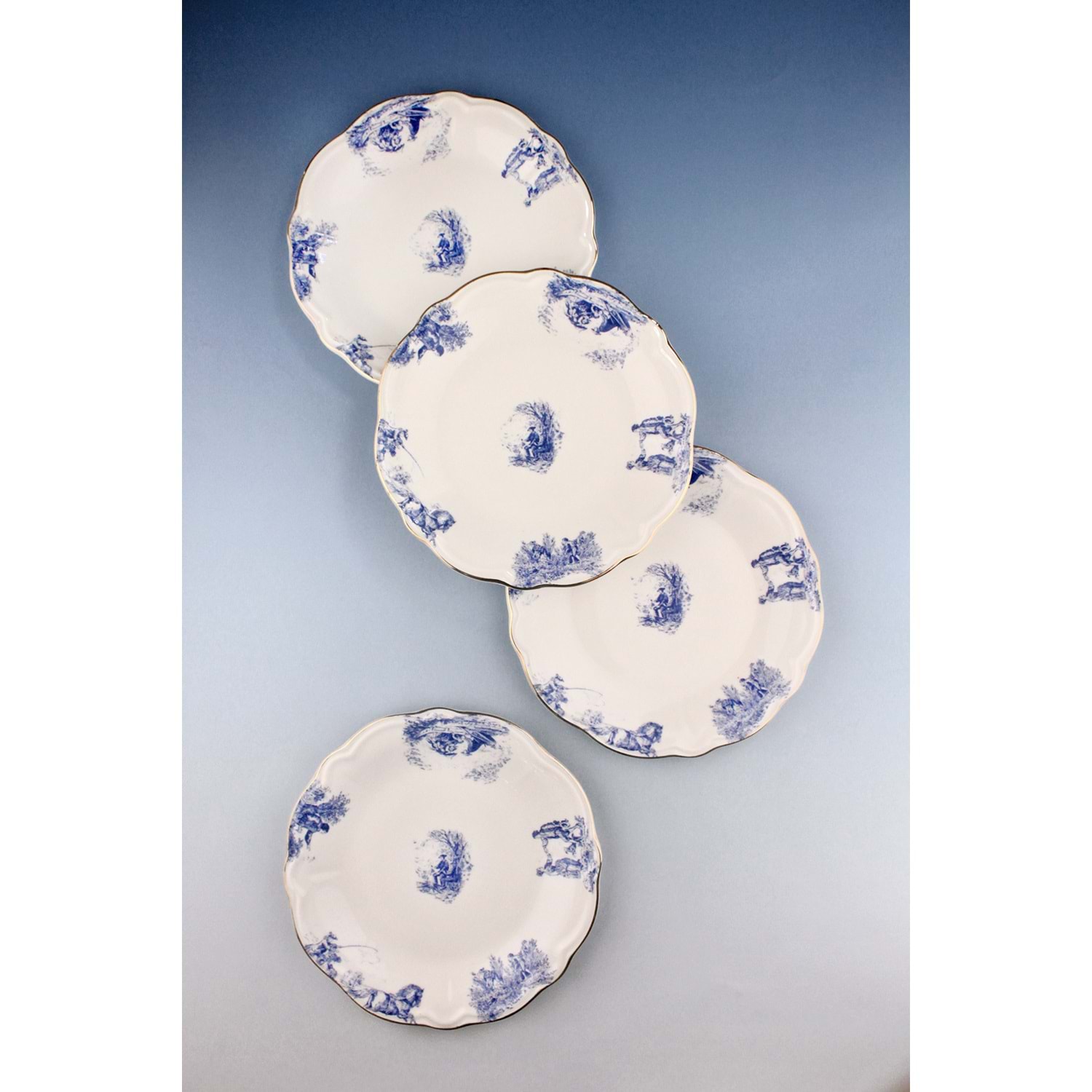 Mavi İngiliz altın yaldızlı 4 parça porselen pasta tabağı