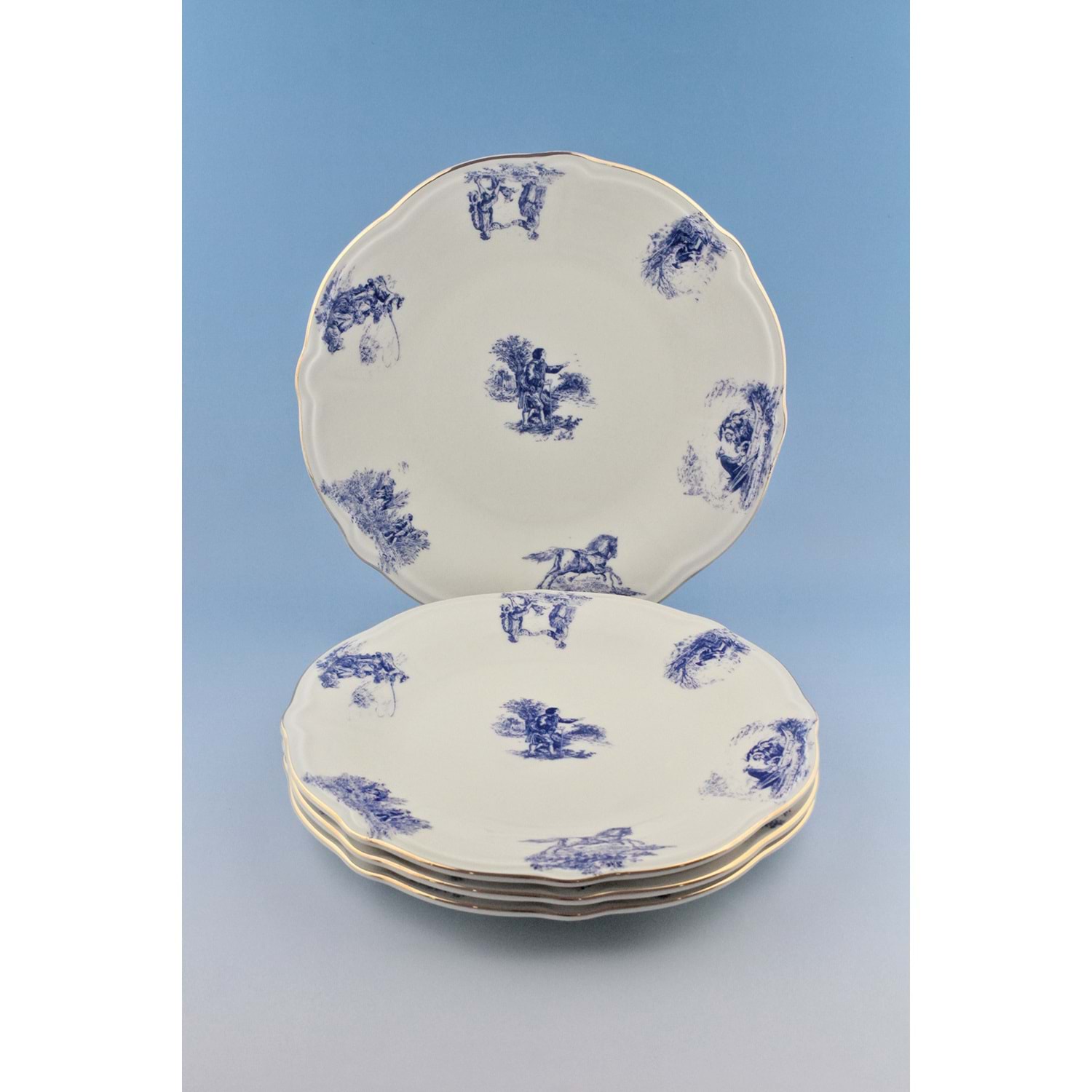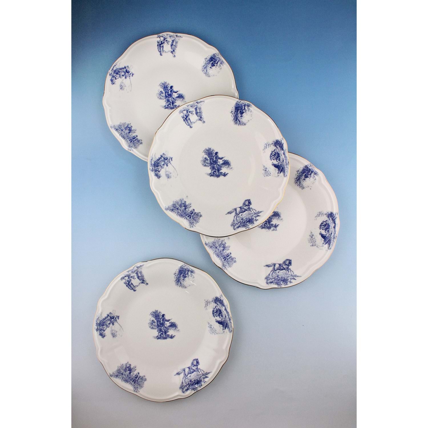 Mavi İngiliz altın yaldızlı 4 parça porselen servis tabağı
